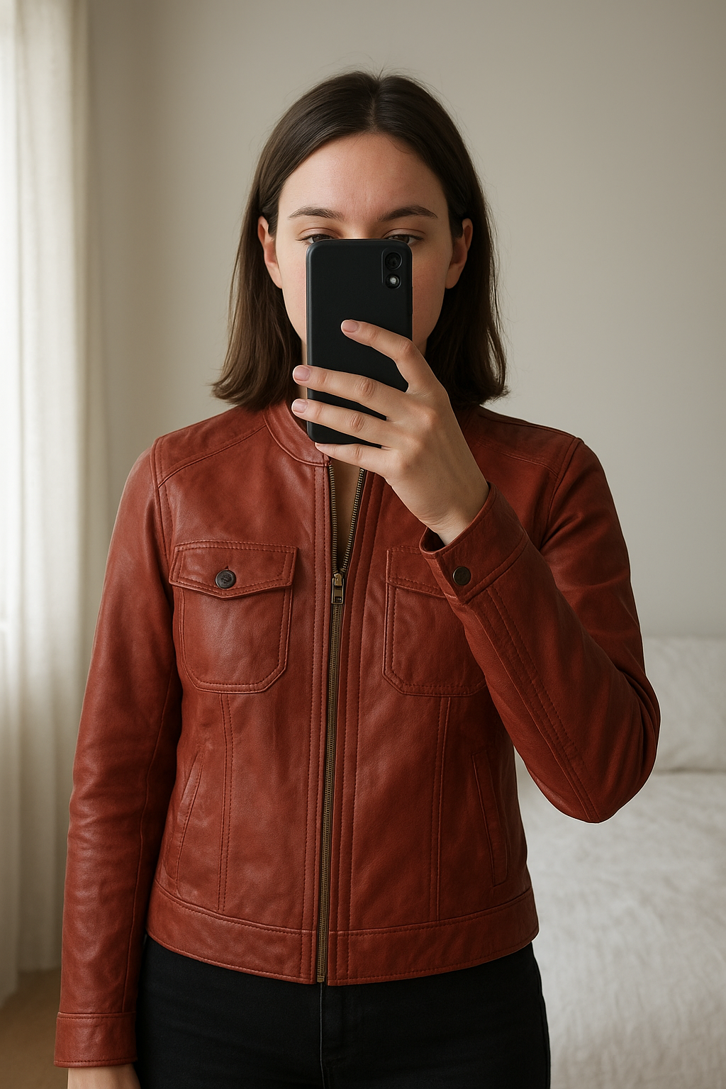 Blouson Bonobo bordeaux debout, face à la caméra, dans une chambre à la lumière douce, avec une lumière naturelle filtrant par la fenêtre.