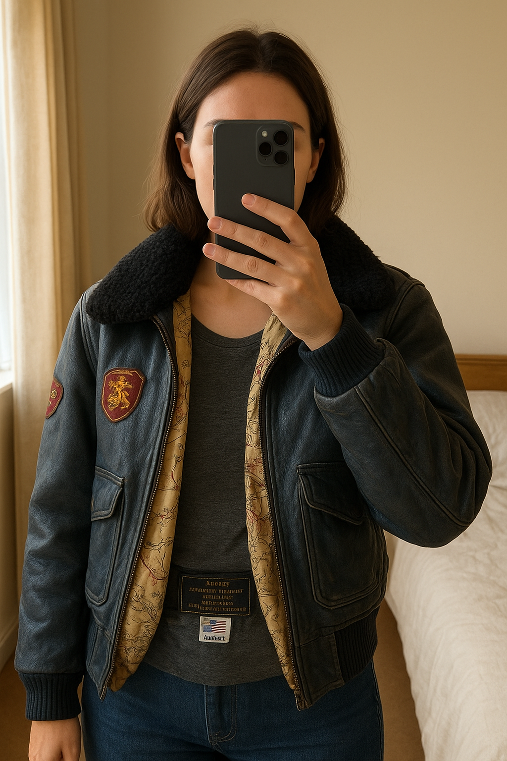 Blouson Cuir Avirex debout, face à la caméra, dans une chambre à la lumière douce, avec une lumière naturelle filtrant par la fenêtre.