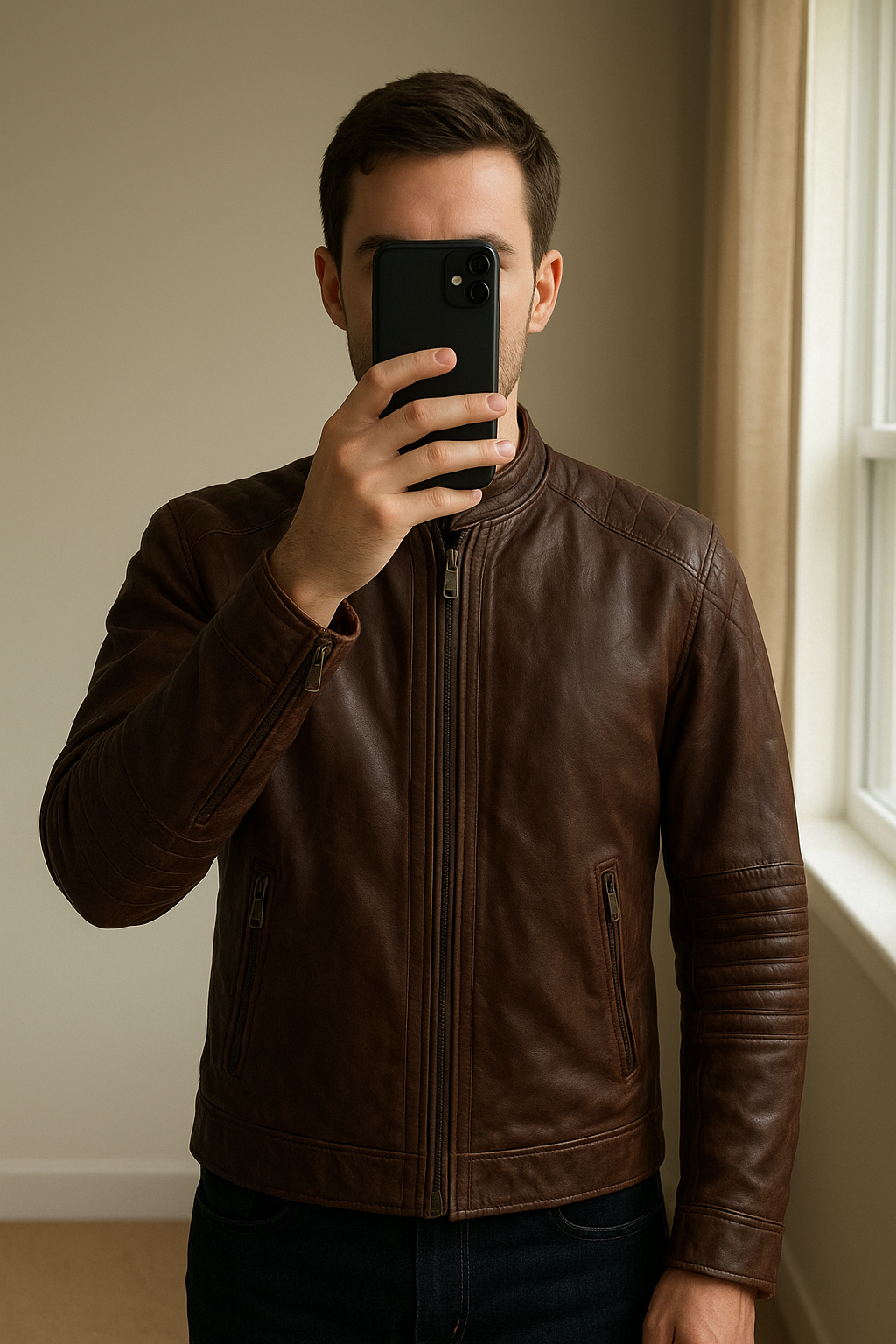 Blouson Homme Agneau Plongé Taille M -38 debout, face à la caméra, dans une chambre à la lumière douce, avec une lumière naturelle filtrant par la fenêtre.
