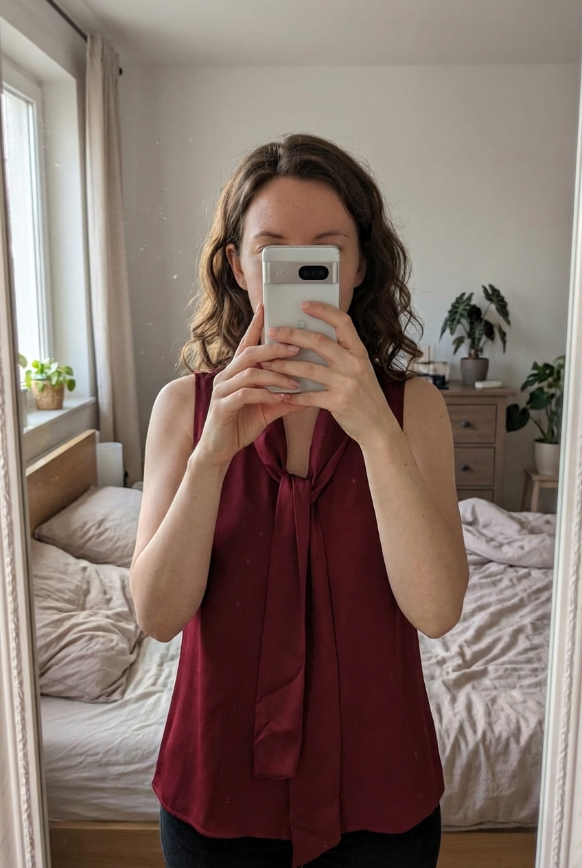 Bluse mit Schluppe aufrecht stehend, der Kamera zugewandt, in einem sanft beleuchteten Schlafzimmer, mit natürlichem Licht, das durch ein Fenster fällt.
