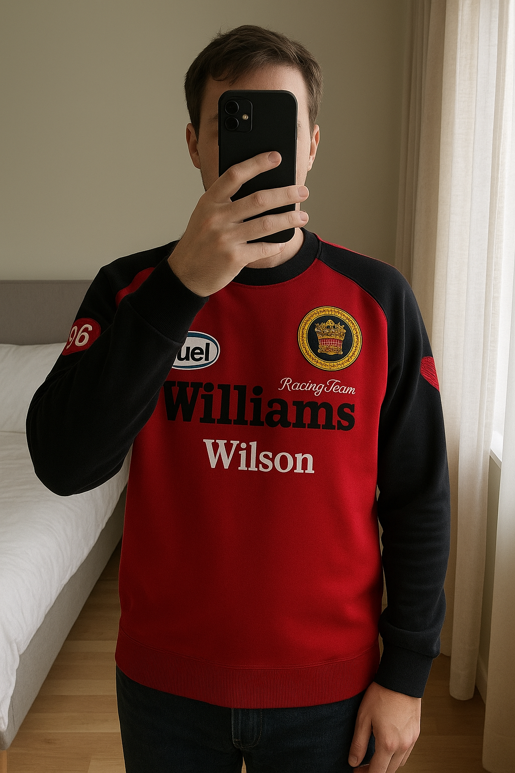 Bluza Williams Racing Team Wilson standing straight facing the camera, in a softly lit bedroom setting, with gentle natural light filtering through a window.