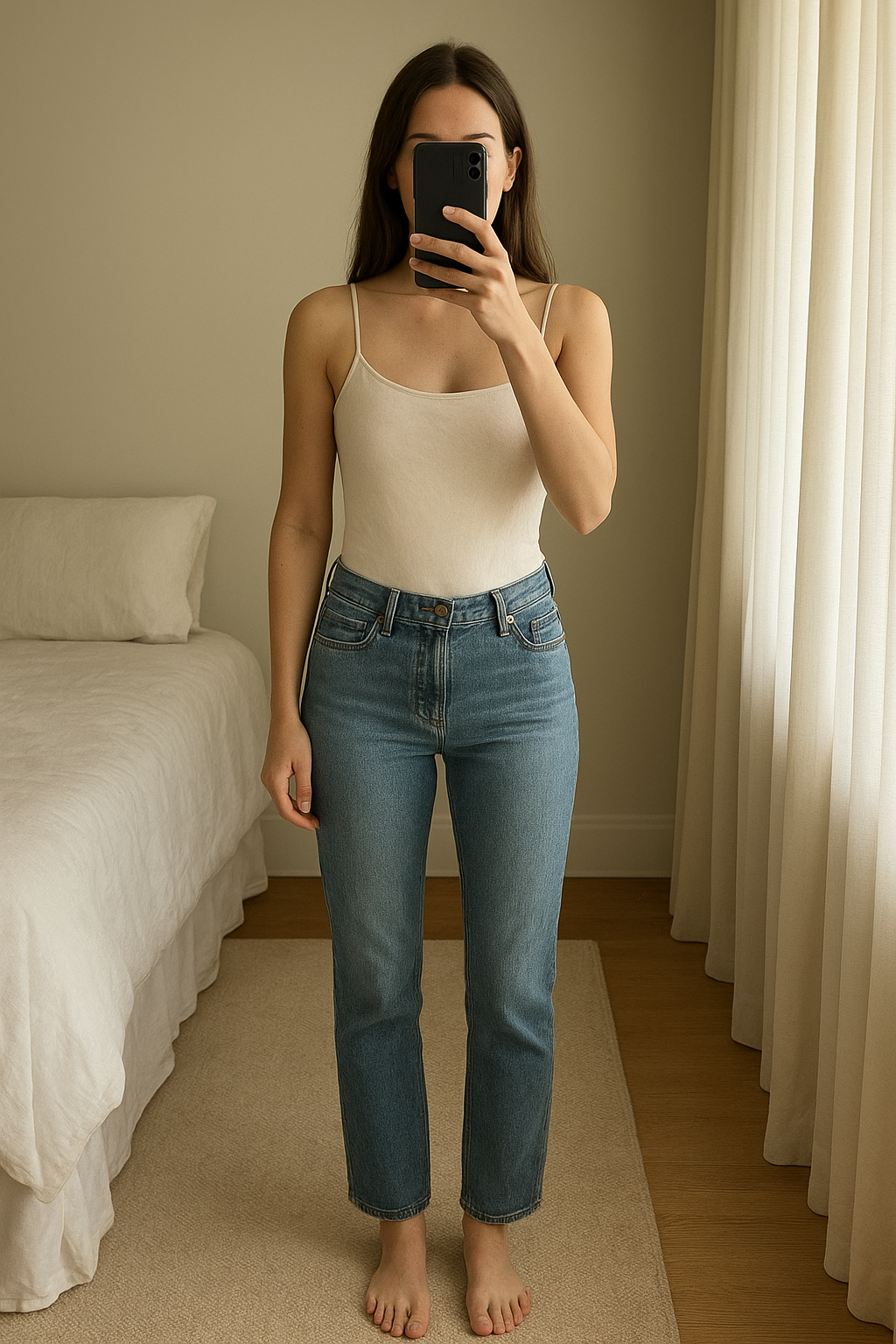 Body blanc debout, face à la caméra, dans une chambre à la lumière douce, avec une lumière naturelle filtrant par la fenêtre.