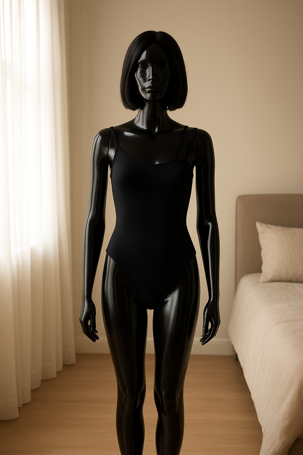 un mannequin noir brillant en plastique, sans traits du visage en Body noir, shein, S debout, face à la caméra, dans une chambre à la lumière douce, avec une lumière naturelle filtrant par la fenêtre.