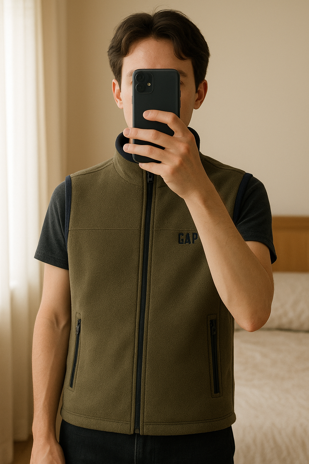 Bodywarmer - GAP - maat L - erg goed! debout, face à la caméra, dans une chambre à la lumière douce, avec une lumière naturelle filtrant par la fenêtre.