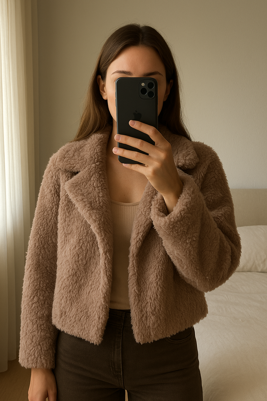 Boléro fausse fourrure Jensen women – Élegant & chic – Très bon état debout, face à la caméra, dans une chambre à la lumière douce, avec une lumière naturelle filtrant par la fenêtre.