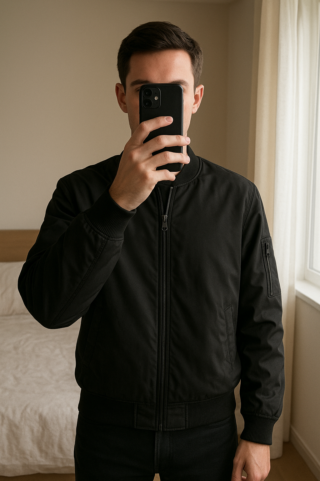 Bomber Calvin Klein Jeans debout, face à la caméra, dans une chambre à la lumière douce, avec une lumière naturelle filtrant par la fenêtre.