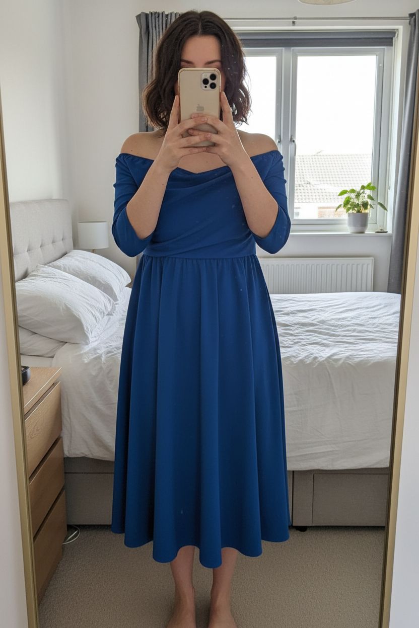 Eine Person in Boohoo Cocktailkleid Skaterstil blau Off-Shoulder Gr. 44 aufrecht stehend, der Kamera zugewandt, in einem sanft beleuchteten Schlafzimmer, mit natürlichem Licht, das durch ein Fenster fällt.