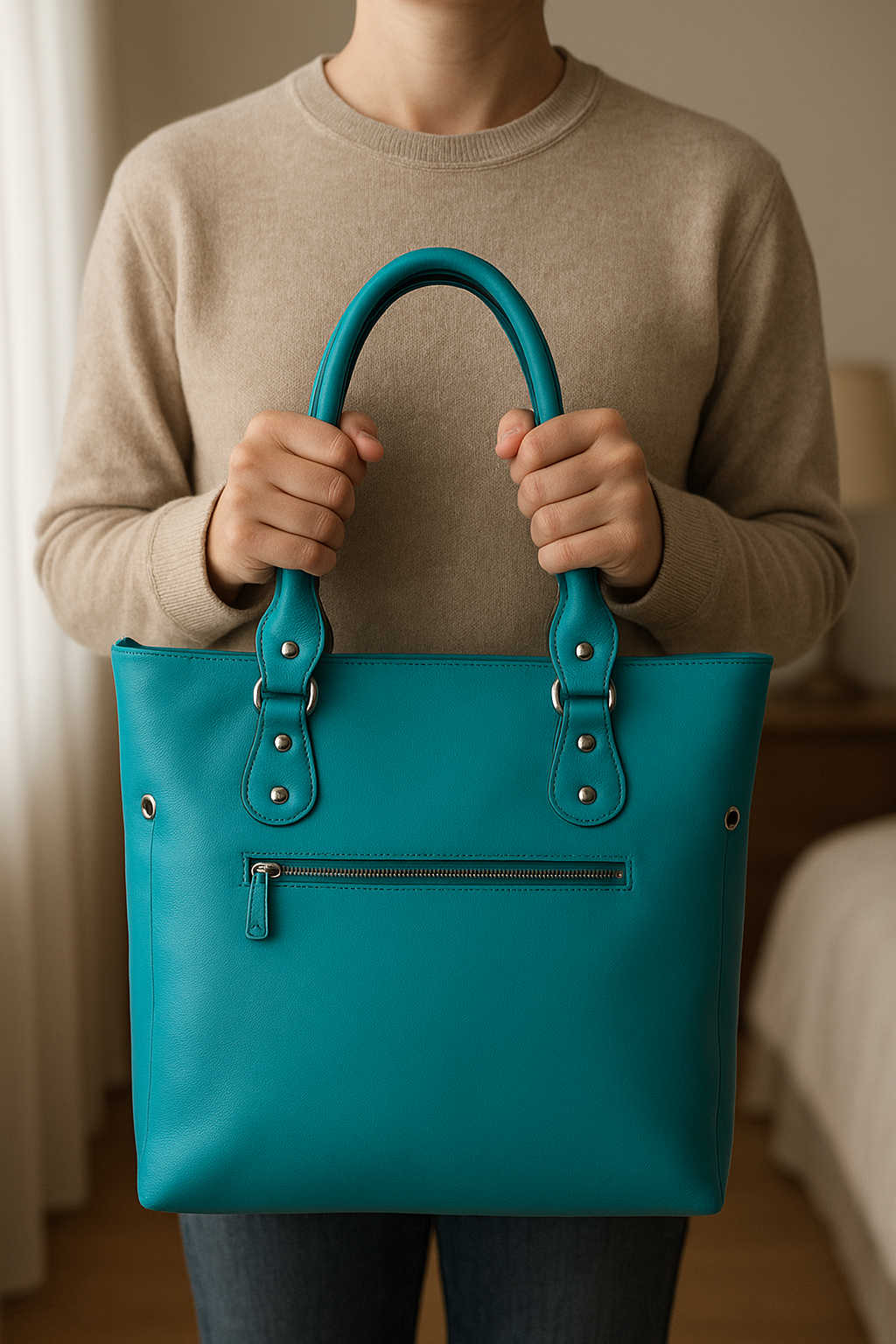 Borsa grande turchese mano/spalla in piedi, rivolto verso la fotocamera, in una camera da letto con luce soffusa e luce naturale che filtra dalla finestra.