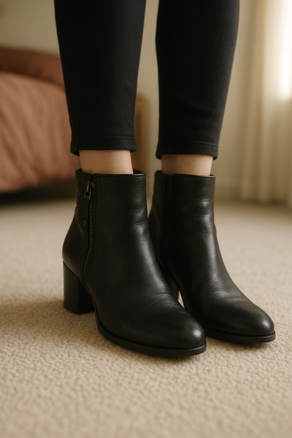 Bottines cuir debout, face à la caméra, dans une chambre à la lumière douce, avec une lumière naturelle filtrant par la fenêtre.