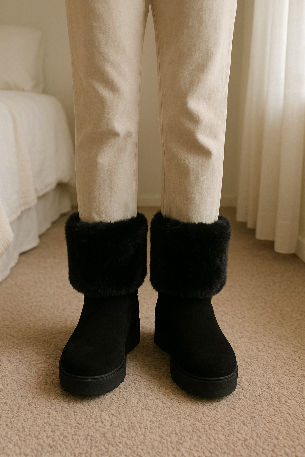 Bottines fourrure debout, face à la caméra, dans une chambre à la lumière douce, avec une lumière naturelle filtrant par la fenêtre.