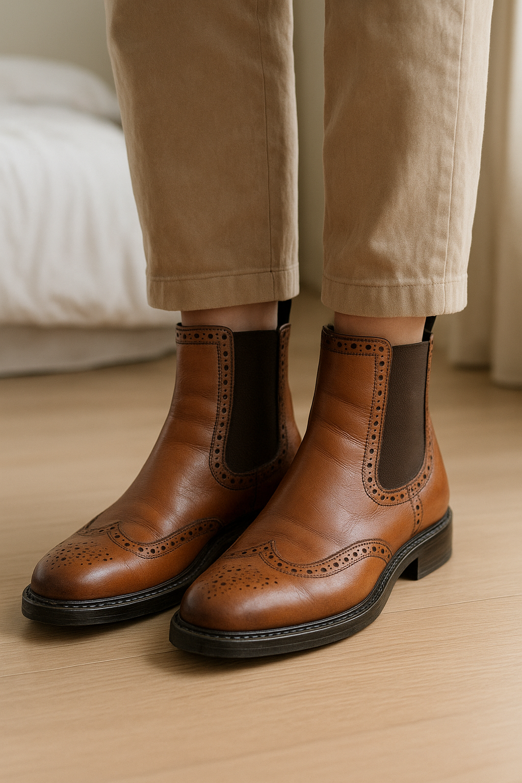 Bottines Melvin Hamilton debout, face à la caméra, dans une chambre à la lumière douce, avec une lumière naturelle filtrant par la fenêtre.