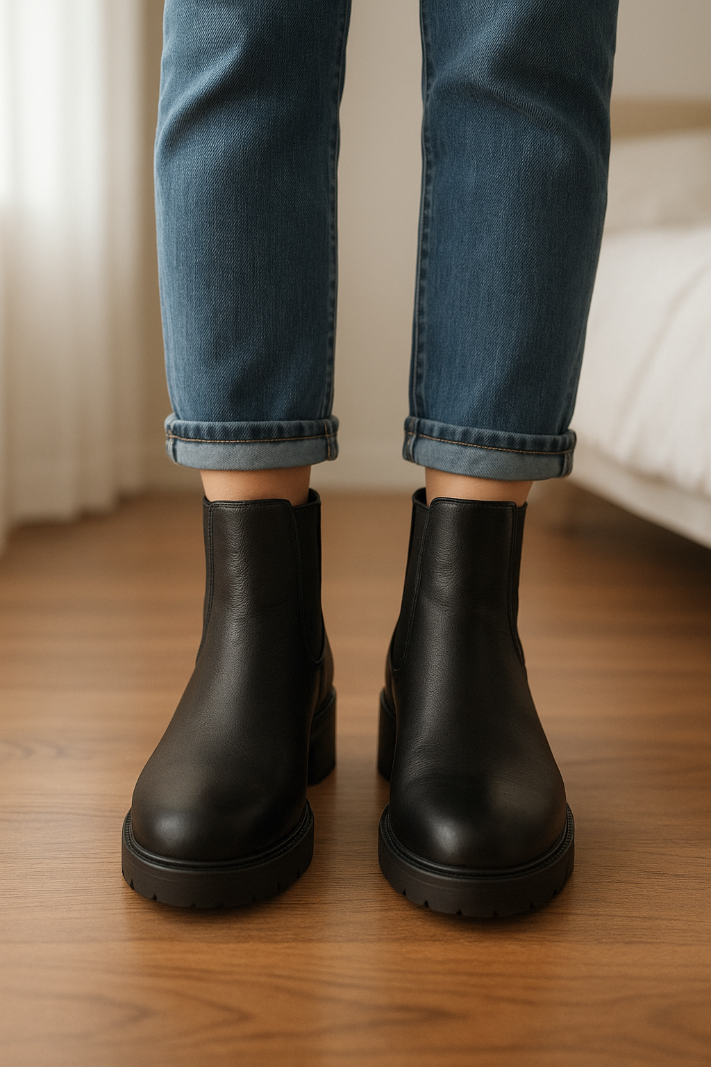 Bottines noires Jonak debout, face à la caméra, dans une chambre à la lumière douce, avec une lumière naturelle filtrant par la fenêtre.