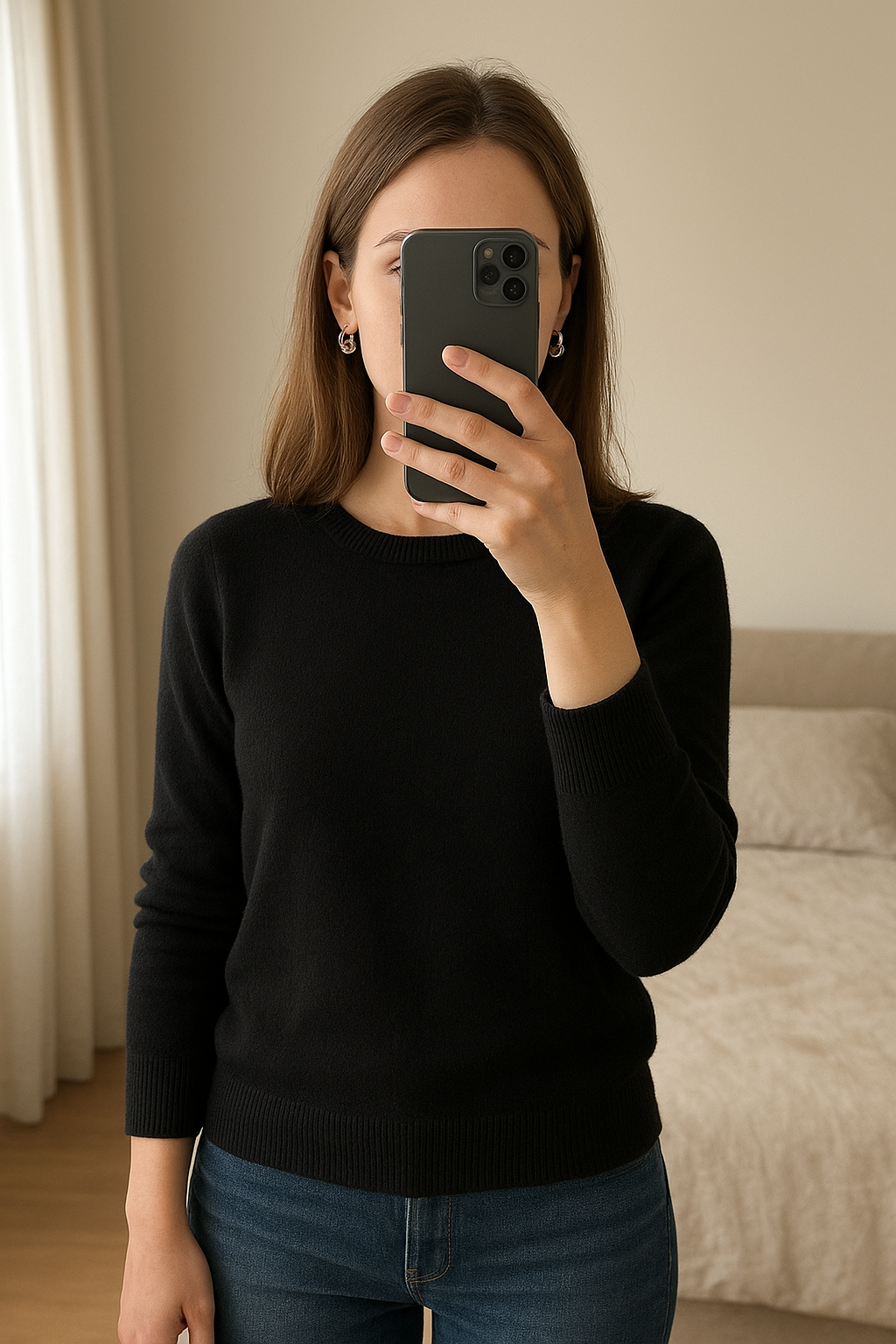 Boucles oreilles demi créoles or gris céramique noire debout, face à la caméra, dans une chambre à la lumière douce, avec une lumière naturelle filtrant par la fenêtre.