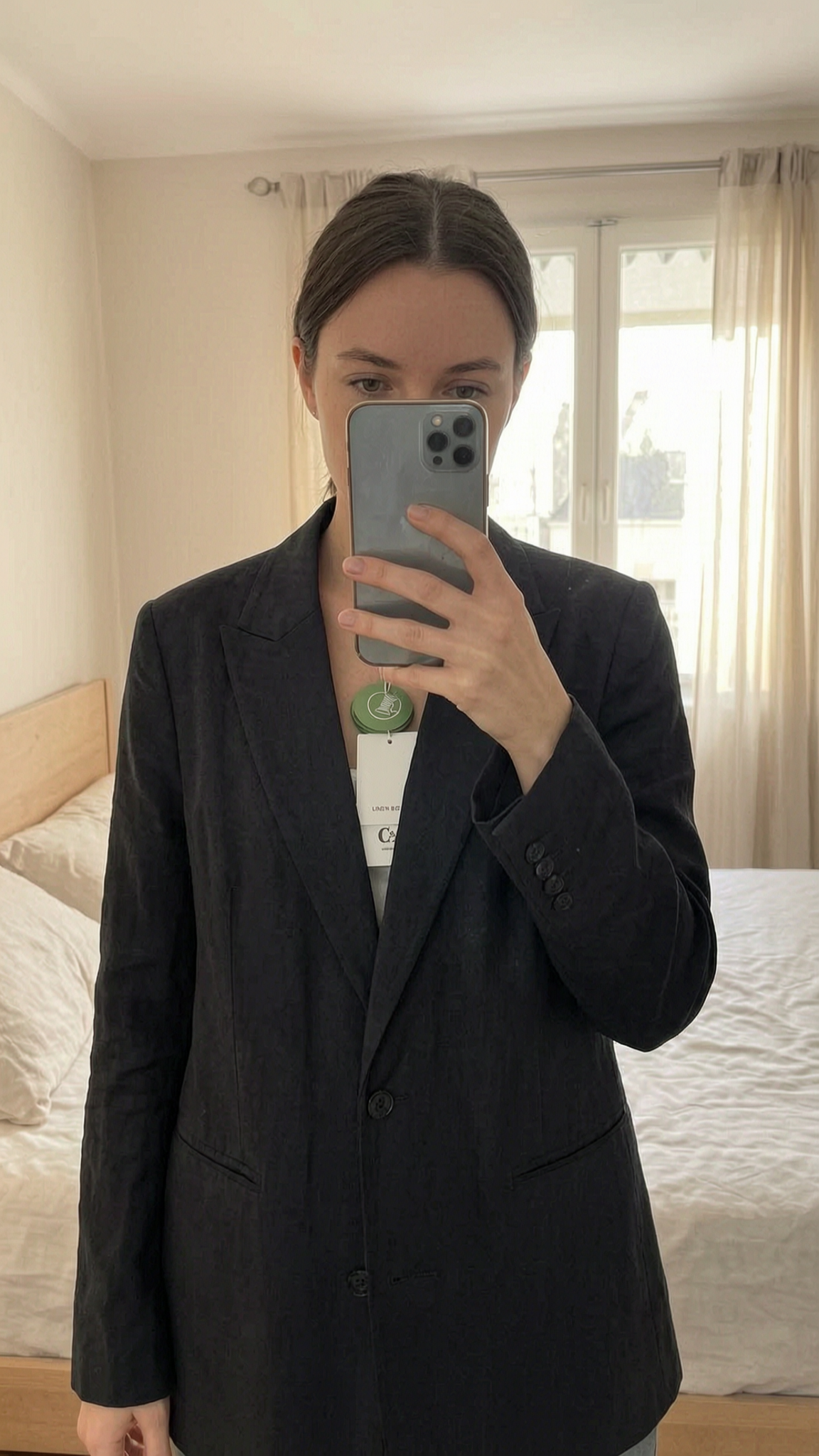 C&A schwarzes Leinenblazer aufrecht stehend, der Kamera zugewandt, in einem sanft beleuchteten Schlafzimmer, mit natürlichem Licht, das durch ein Fenster fällt.
