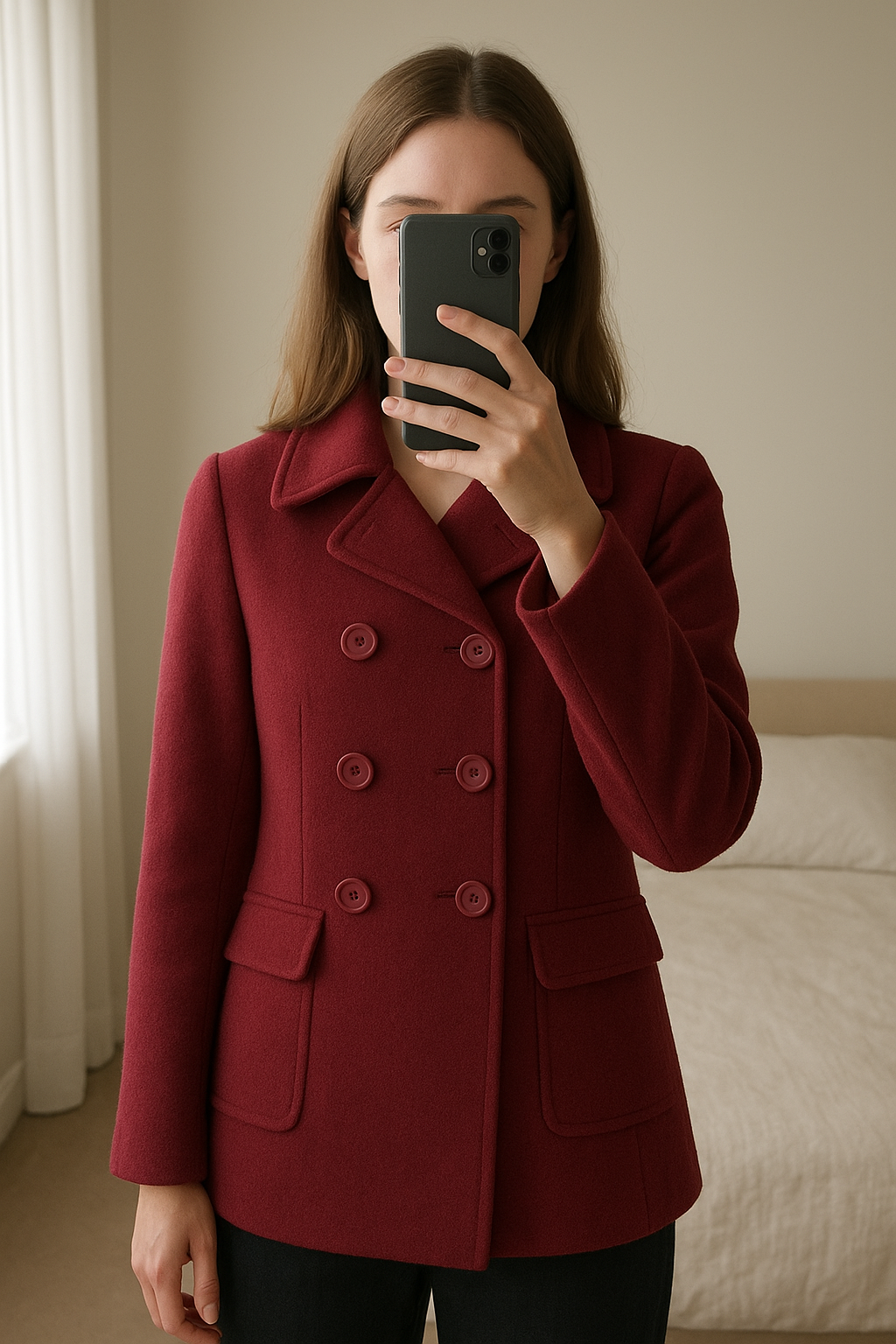 Caban Burton bordeaux taille 38 debout, face à la caméra, dans une chambre à la lumière douce, avec une lumière naturelle filtrant par la fenêtre.
