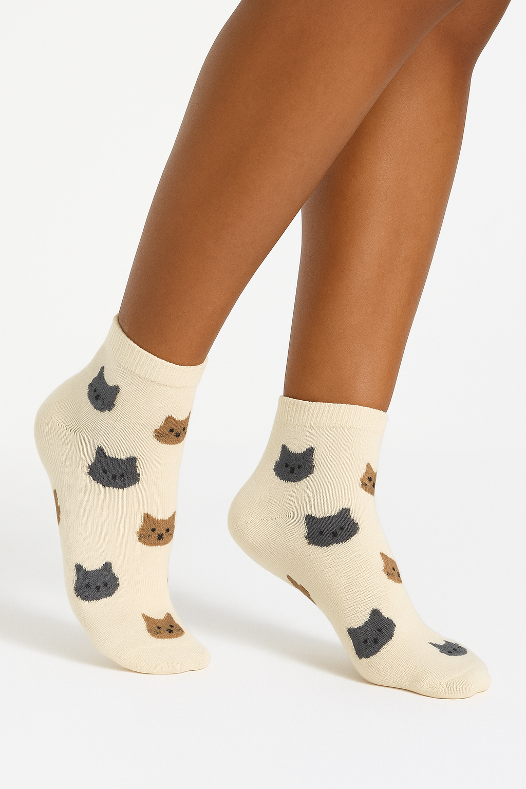 Una persona in Calze con gatti inarcando leggermente la schiena per una posa dinamica, con corporatura snella, in uno studio fotografico pulito con sfondo bianco continuo e illuminazione softbox.