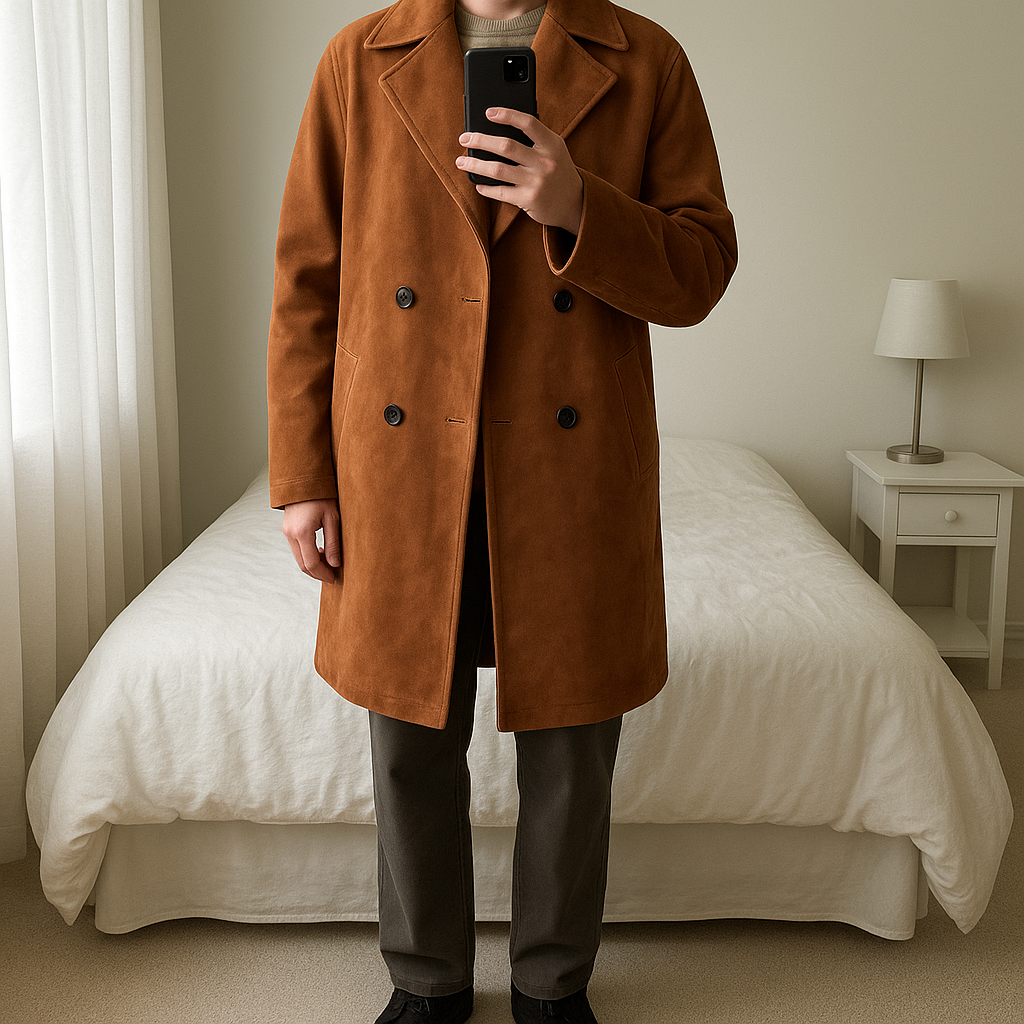 Cape manteau en velours ambiance automne hiver cosy debout, face à la caméra, dans une chambre à la lumière douce, avec une lumière naturelle filtrant par la fenêtre.