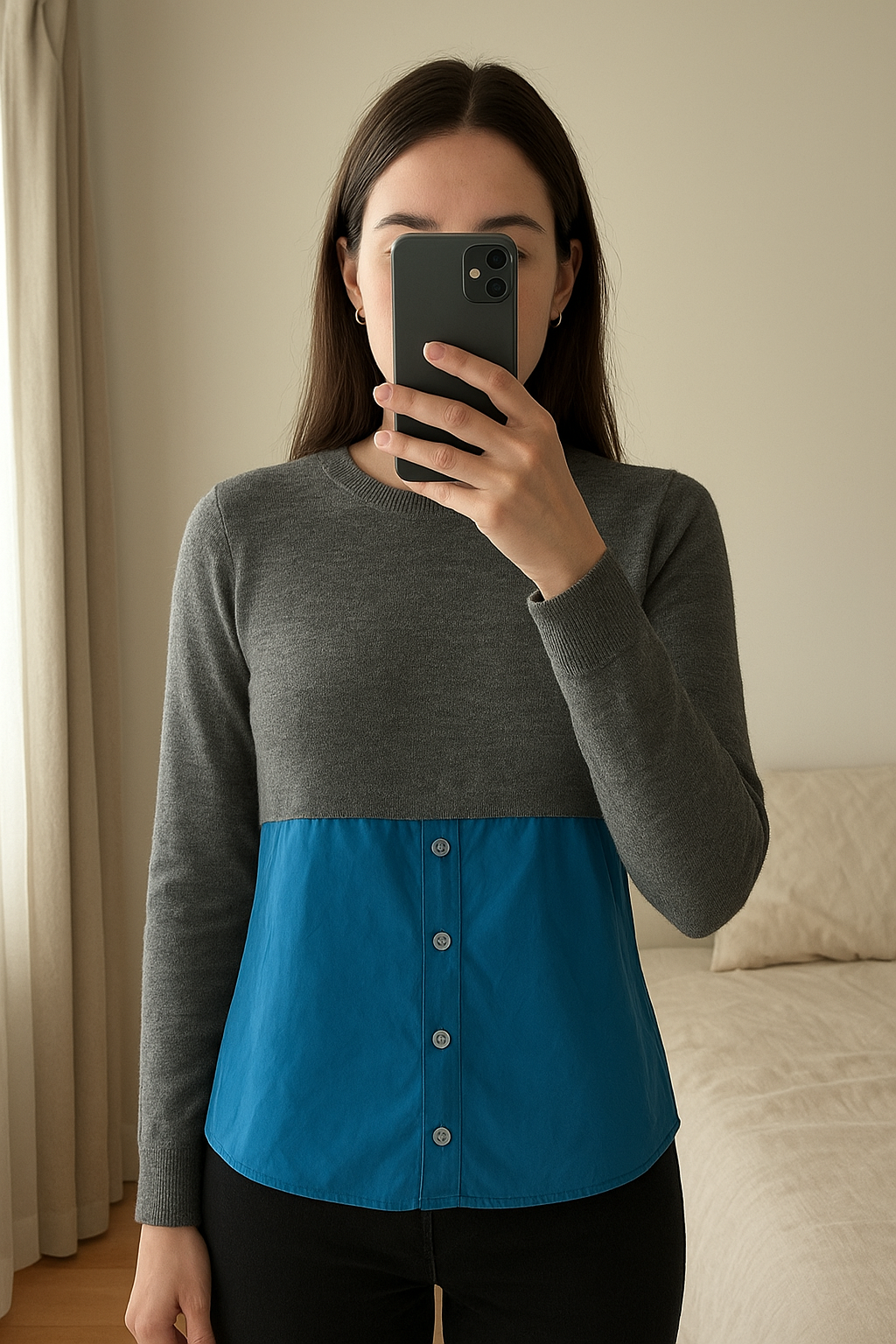 Cardigan chemisier Sandro T36 neuf debout, face à la caméra, dans une chambre à la lumière douce, avec une lumière naturelle filtrant par la fenêtre.
