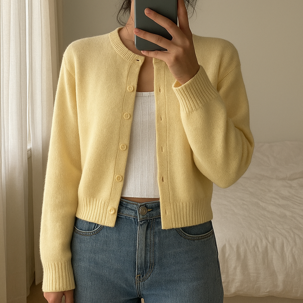 Cardigan jaune femme debout, face à la caméra, dans une chambre à la lumière douce, avec une lumière naturelle filtrant par la fenêtre.