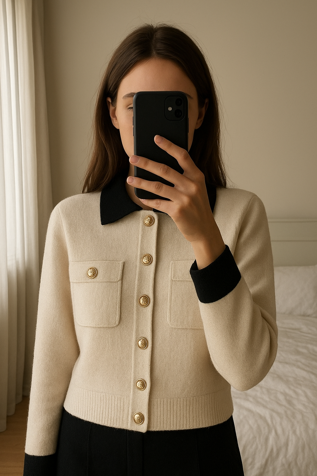 Cardigan Sandro écru contrasté T36 neuf debout, face à la caméra, dans une chambre à la lumière douce, avec une lumière naturelle filtrant par la fenêtre.