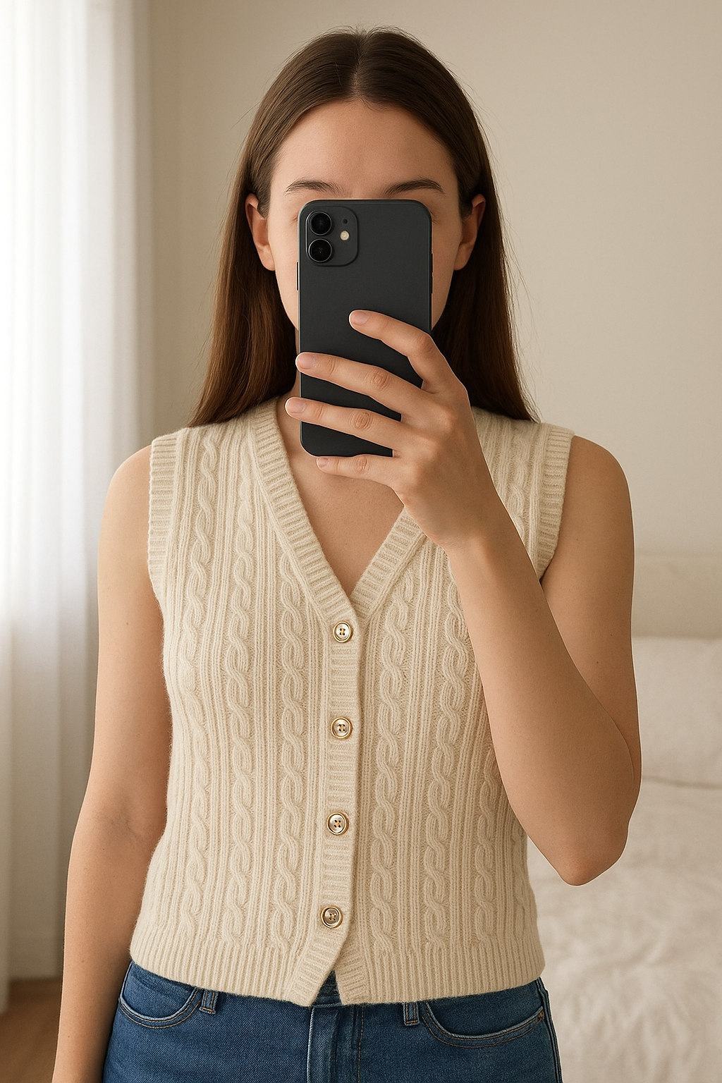Cardigan sans manches Veston en laine melangée T36 neuf debout, face à la caméra, dans une chambre à la lumière douce, avec une lumière naturelle filtrant par la fenêtre.