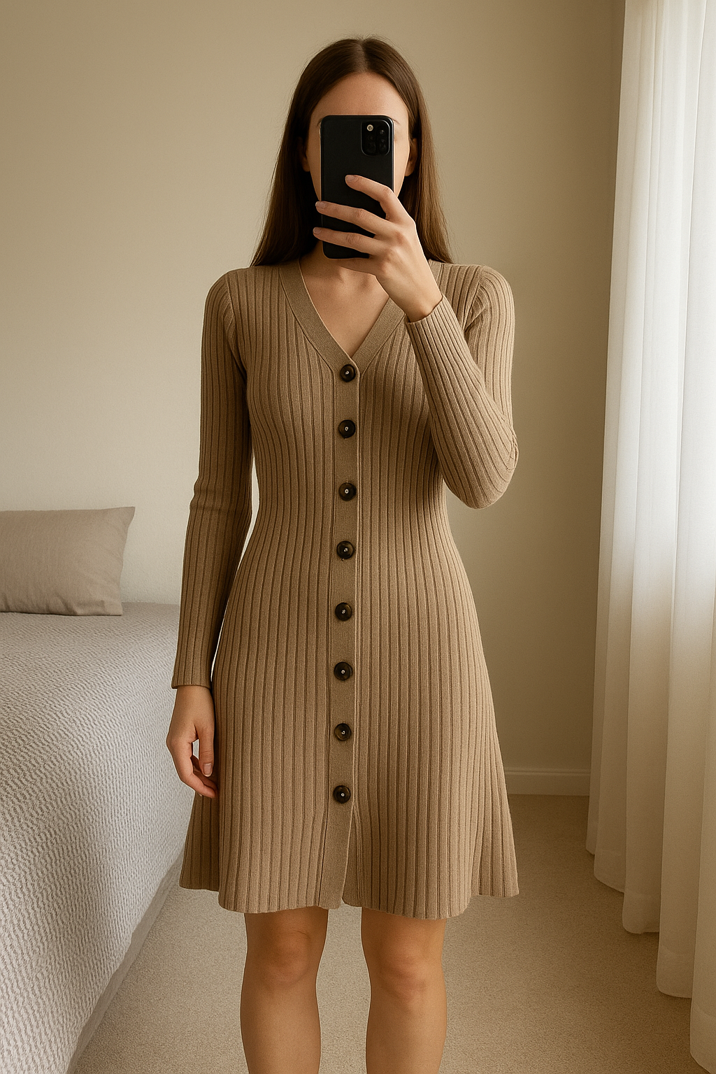 Cardigan taille unique debout, face à la caméra, dans une chambre à la lumière douce, avec une lumière naturelle filtrant par la fenêtre.