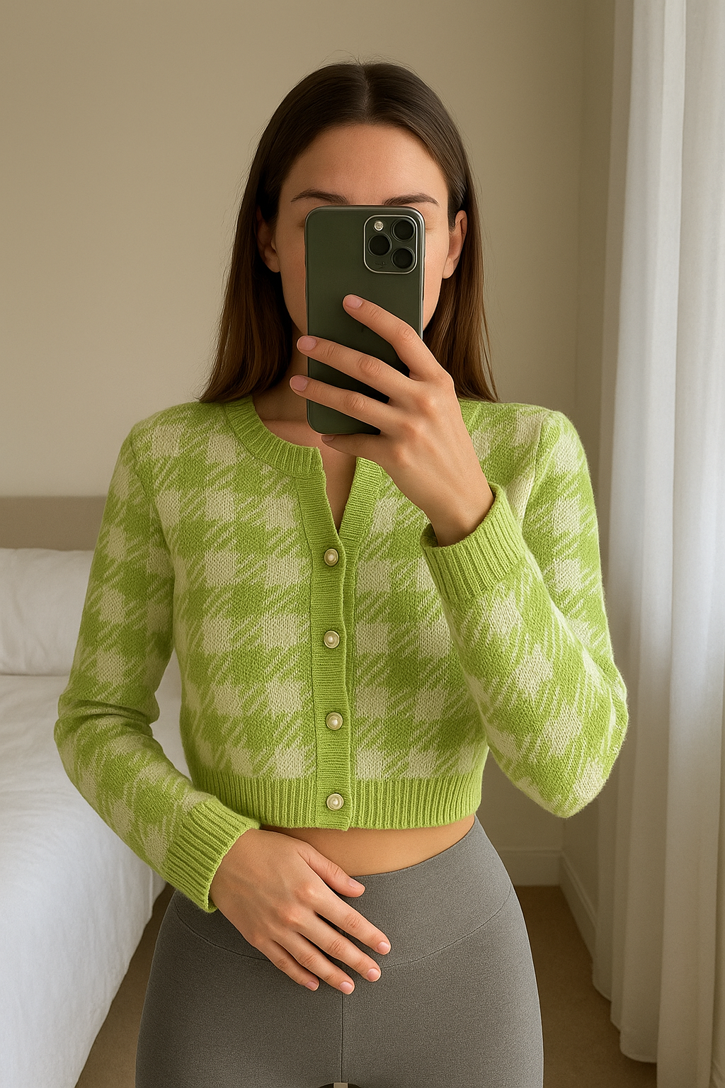 Cardigan Vert Boutonné Mango debout, face à la caméra, dans une chambre à la lumière douce, avec une lumière naturelle filtrant par la fenêtre.