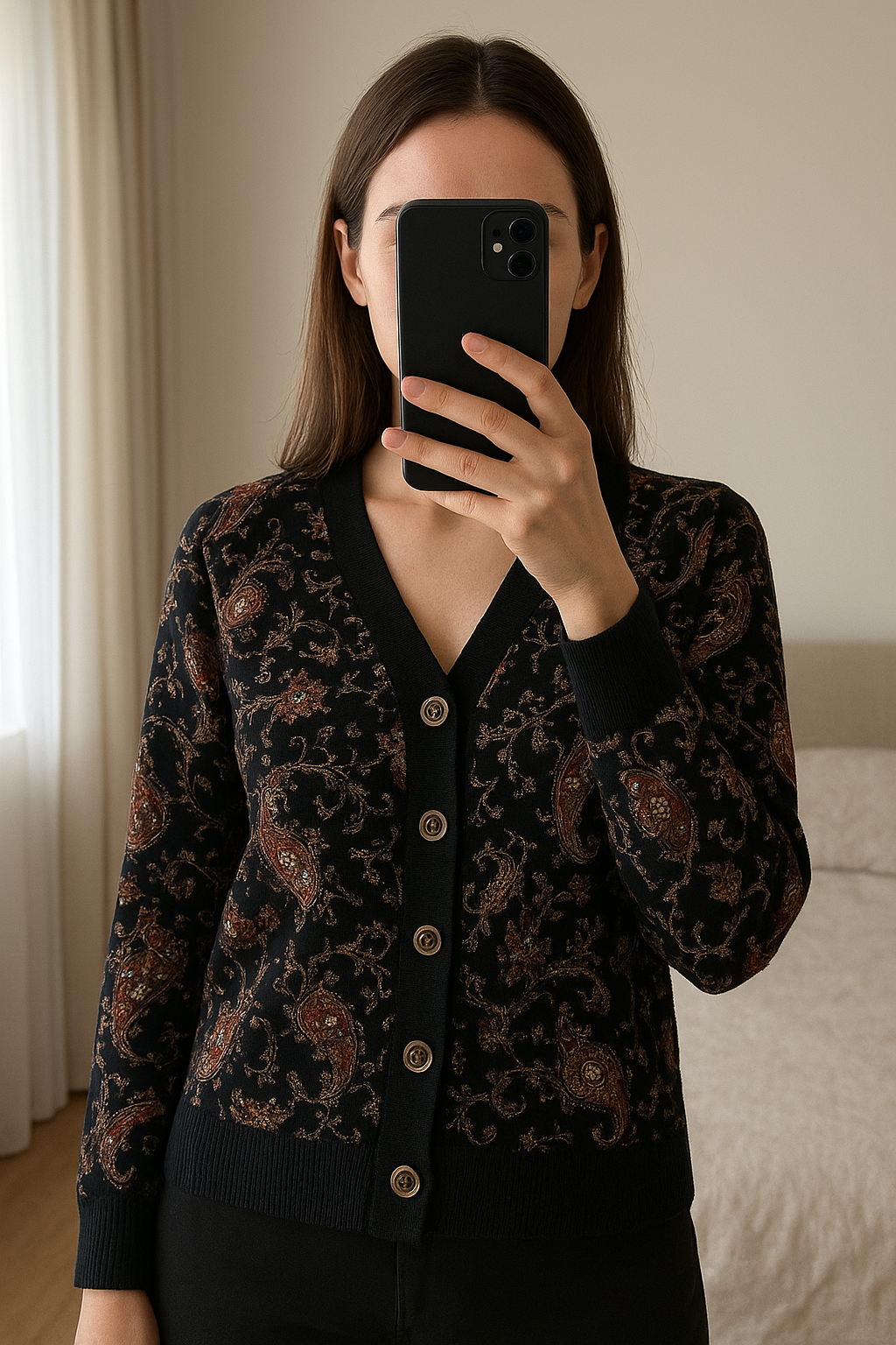Cardigan vintage psychédélique debout, face à la caméra, dans une chambre à la lumière douce, avec une lumière naturelle filtrant par la fenêtre.