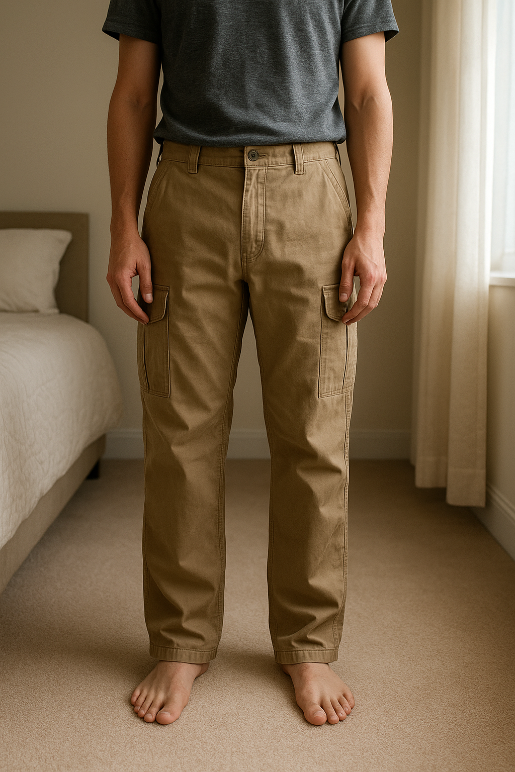 Cargos beige debout, face à la caméra, dans une chambre à la lumière douce, avec une lumière naturelle filtrant par la fenêtre.