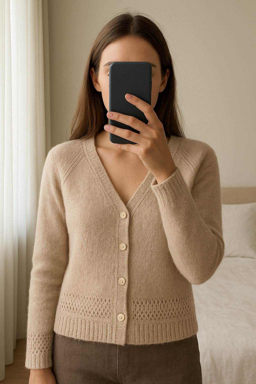 Cartigan Maille Fine Sézane Beige Taille S debout, face à la caméra, dans une chambre à la lumière douce, avec une lumière naturelle filtrant par la fenêtre.