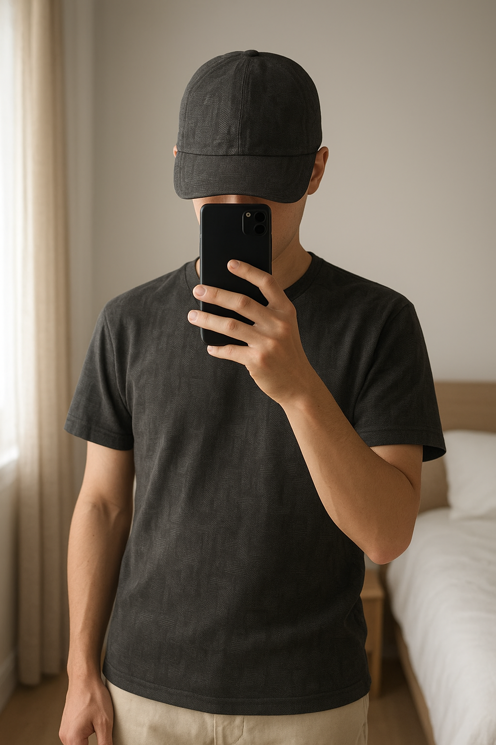 Casquette FF debout, face à la caméra, dans une chambre à la lumière douce, avec une lumière naturelle filtrant par la fenêtre.