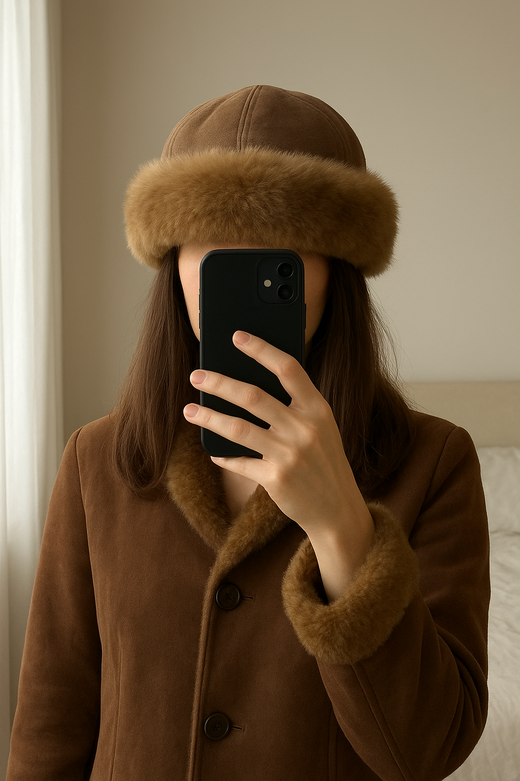 Chapka toque chapeau fourrure cuir debout, face à la caméra, dans une chambre à la lumière douce, avec une lumière naturelle filtrant par la fenêtre.