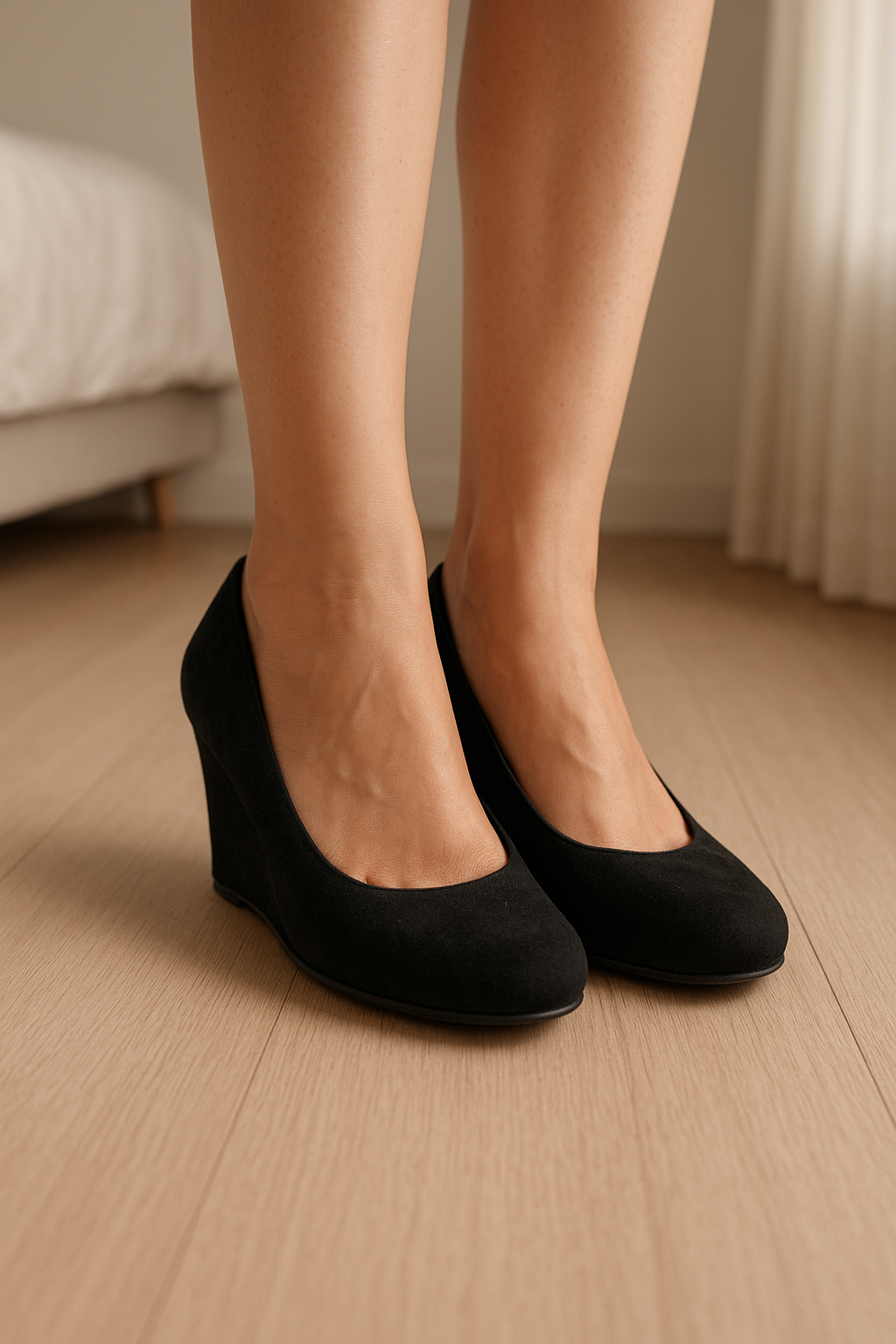 Chaussures San Marina Taille 39 talons compensés debout, face à la caméra, dans une chambre à la lumière douce, avec une lumière naturelle filtrant par la fenêtre.