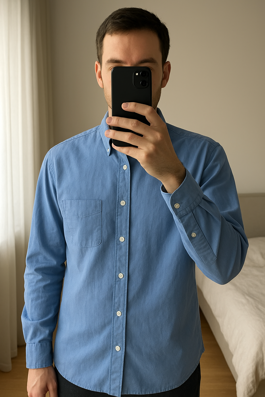 Chemise bleue Homme debout, face à la caméra, dans une chambre à la lumière douce, avec une lumière naturelle filtrant par la fenêtre.