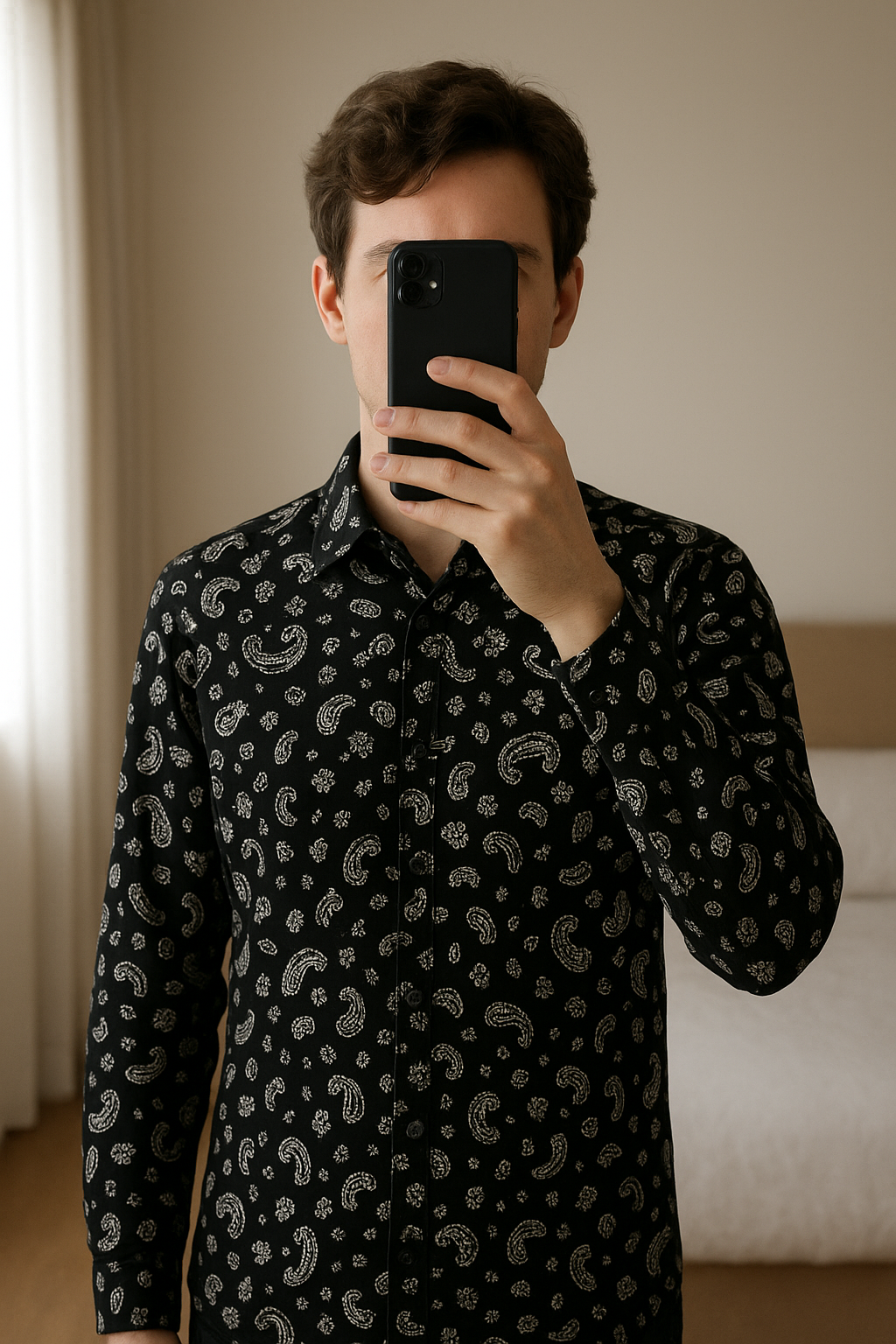 Chemise branchée. debout, face à la caméra, dans une chambre à la lumière douce, avec une lumière naturelle filtrant par la fenêtre.