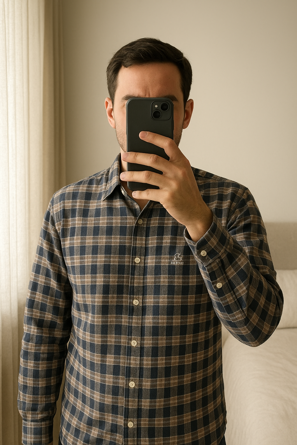 Chemise en flanelle neuve manches longues debout, face à la caméra, dans une chambre à la lumière douce, avec une lumière naturelle filtrant par la fenêtre.