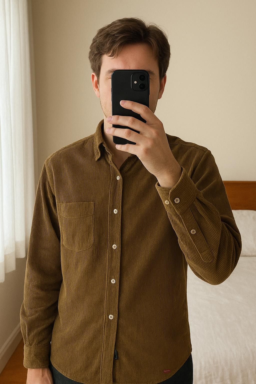 Chemise en velours Scotch & Soda debout, face à la caméra, dans une chambre à la lumière douce, avec une lumière naturelle filtrant par la fenêtre.