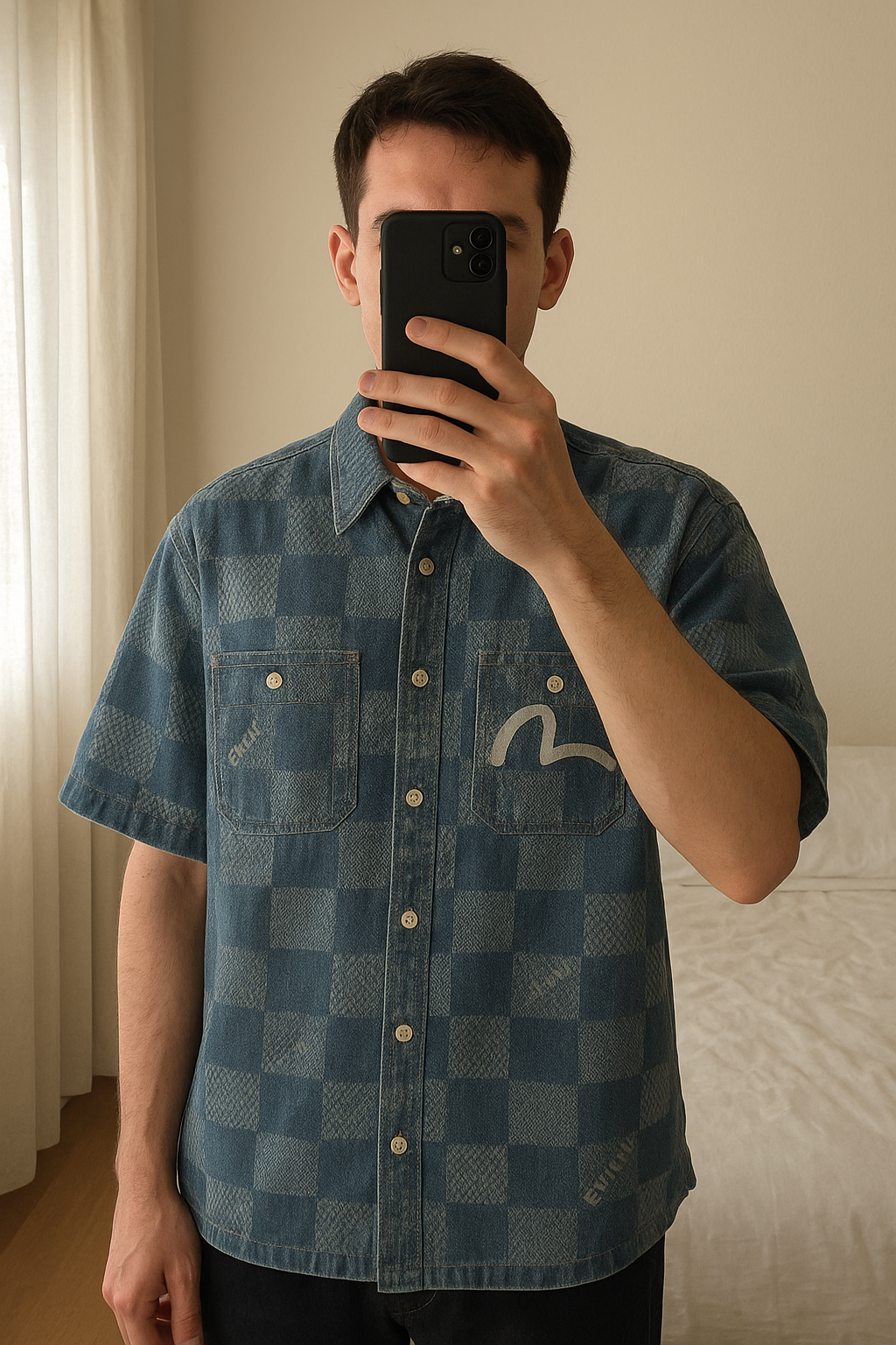 Chemise evisu debout, face à la caméra, dans une chambre à la lumière douce, avec une lumière naturelle filtrant par la fenêtre.