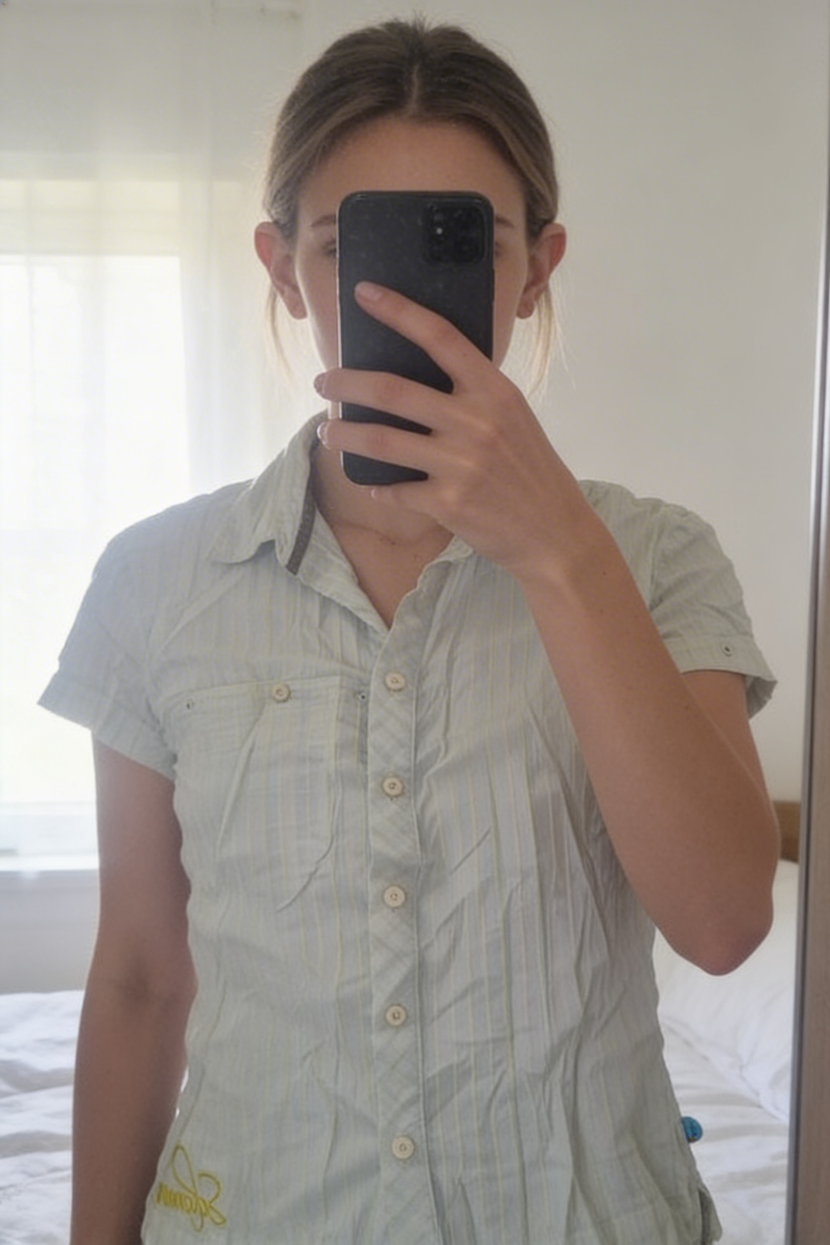 Chemise femme salomon debout, face à la caméra, dans une chambre à la lumière douce, avec une lumière naturelle filtrant par la fenêtre.