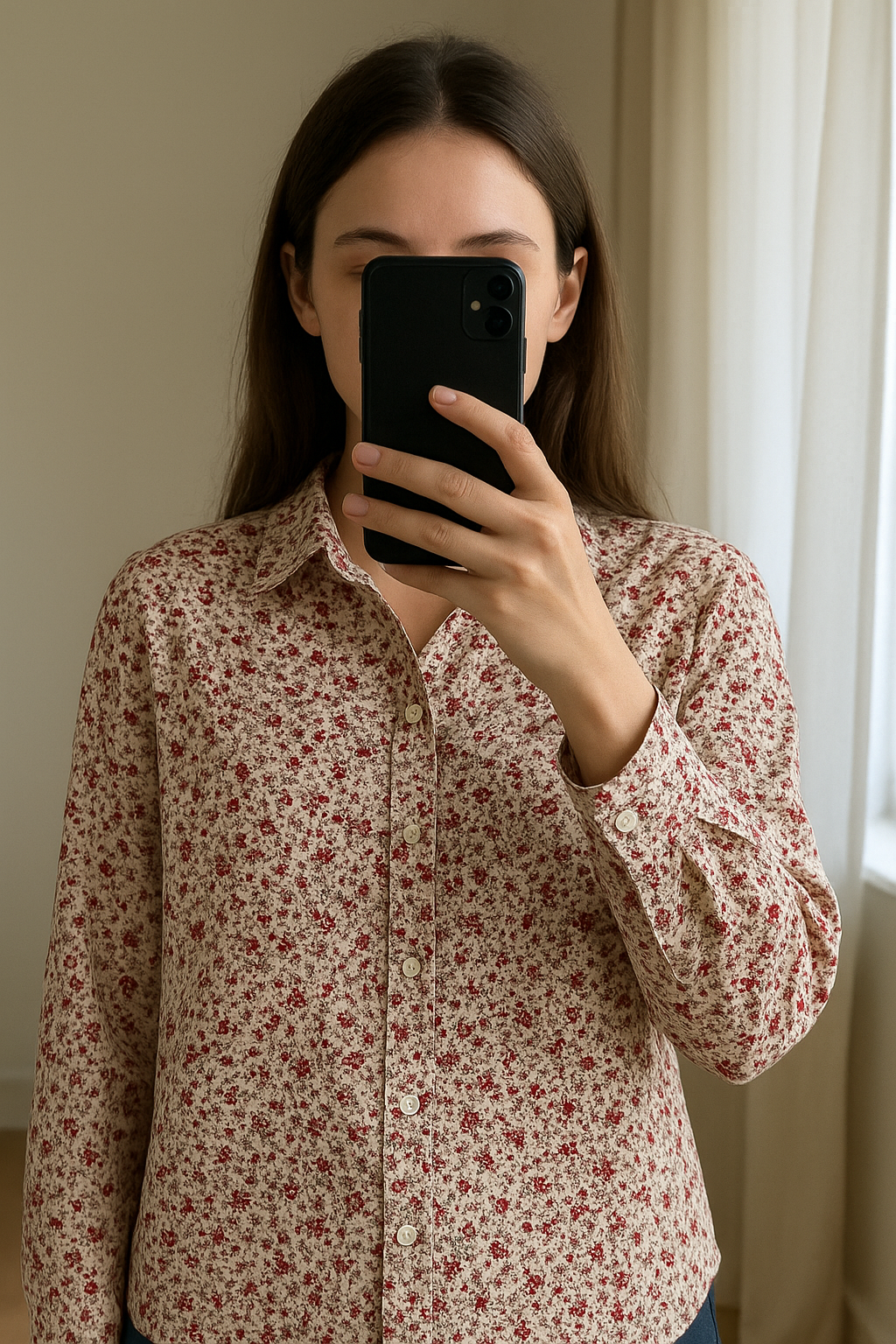 Chemise Flora debout, face à la caméra, dans une chambre à la lumière douce, avec une lumière naturelle filtrant par la fenêtre.