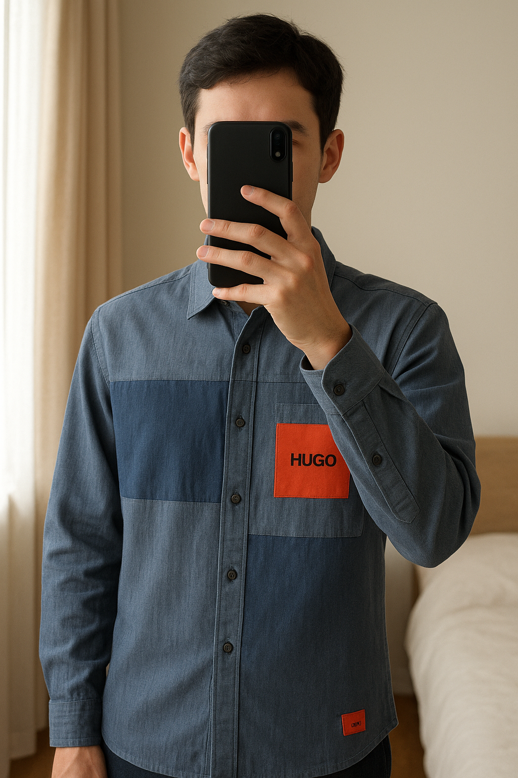 Chemise Hugo Boss debout, face à la caméra, dans une chambre à la lumière douce, avec une lumière naturelle filtrant par la fenêtre.