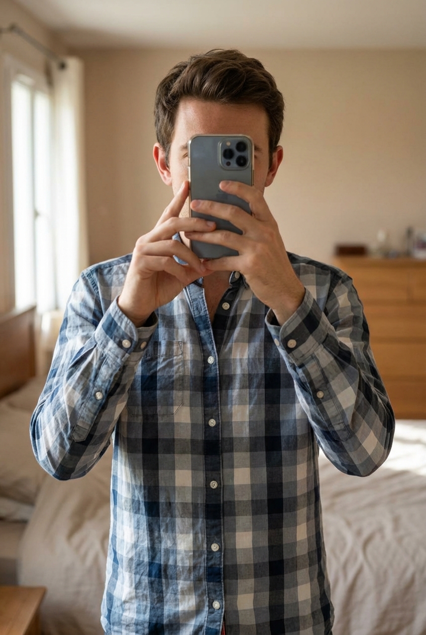 Chemise Jules taille M debout, face à la caméra, dans une chambre à la lumière douce, avec une lumière naturelle filtrant par la fenêtre.
