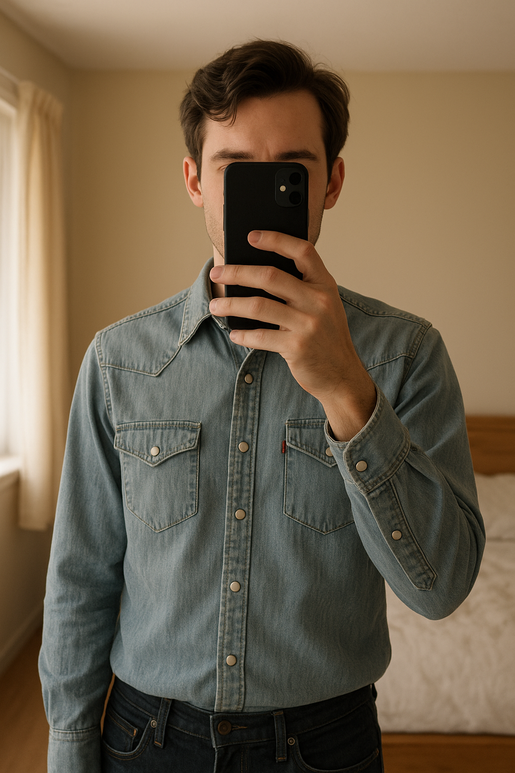 🔵 Chemise Levi’s – Taille M – Jean – Très bon état 🔵 debout, face à la caméra, dans une chambre à la lumière douce, avec une lumière naturelle filtrant par la fenêtre.