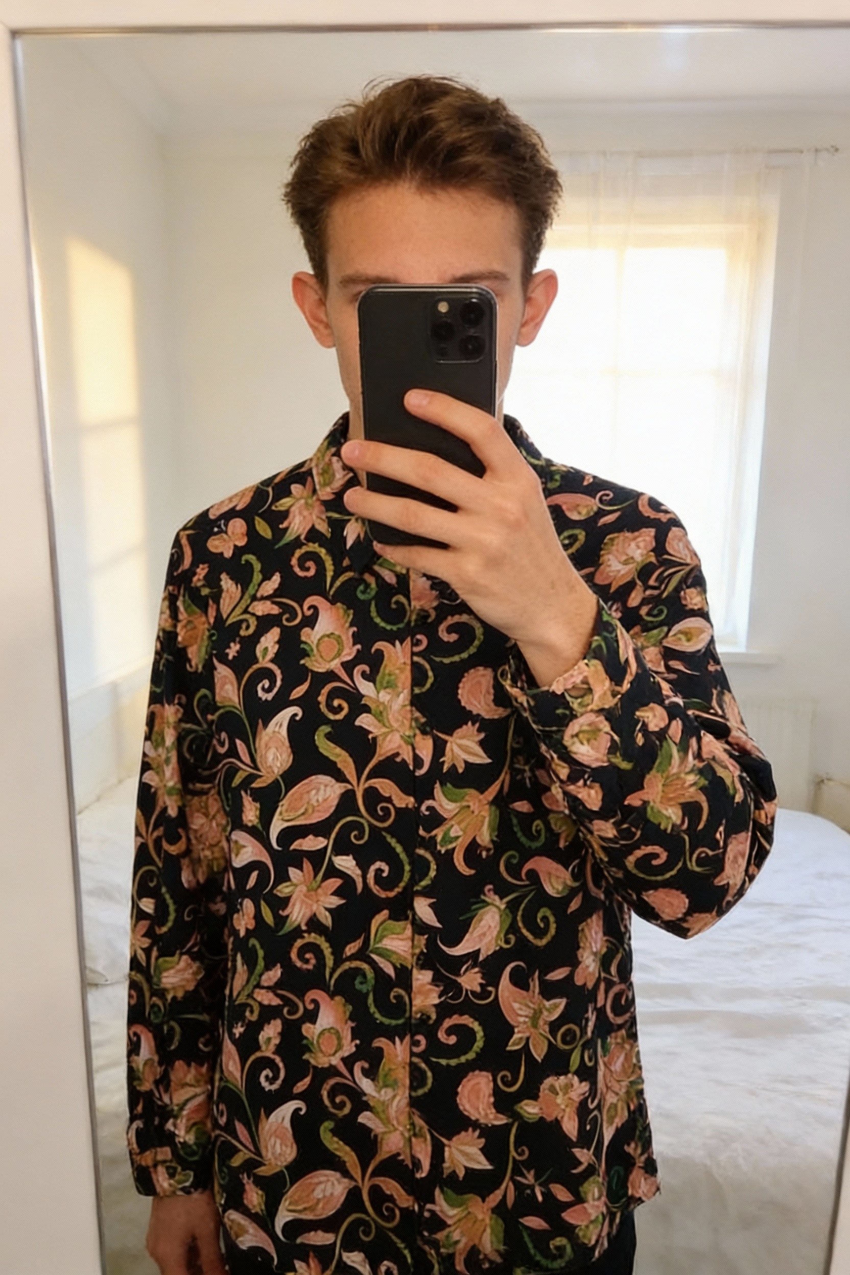 Chemise noire avec motifs fleurs rose et vert debout, face à la caméra, dans une chambre à la lumière douce, avec une lumière naturelle filtrant par la fenêtre.