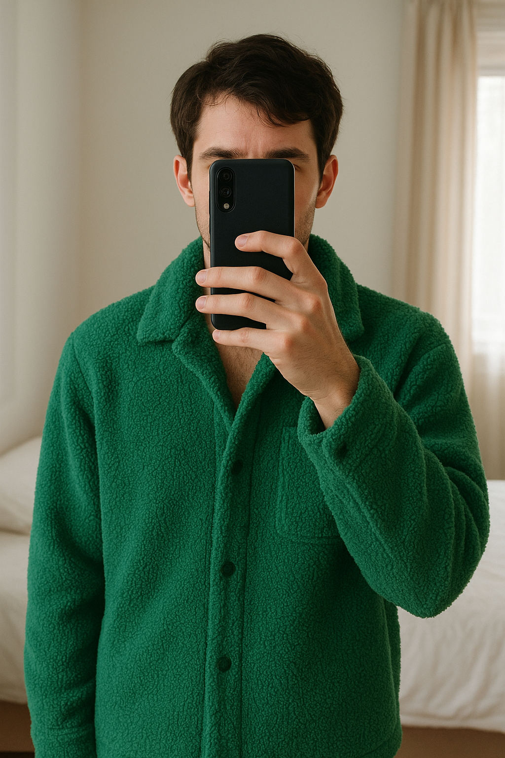 Chemise polaire boohooMAN debout, face à la caméra, dans une chambre à la lumière douce, avec une lumière naturelle filtrant par la fenêtre.