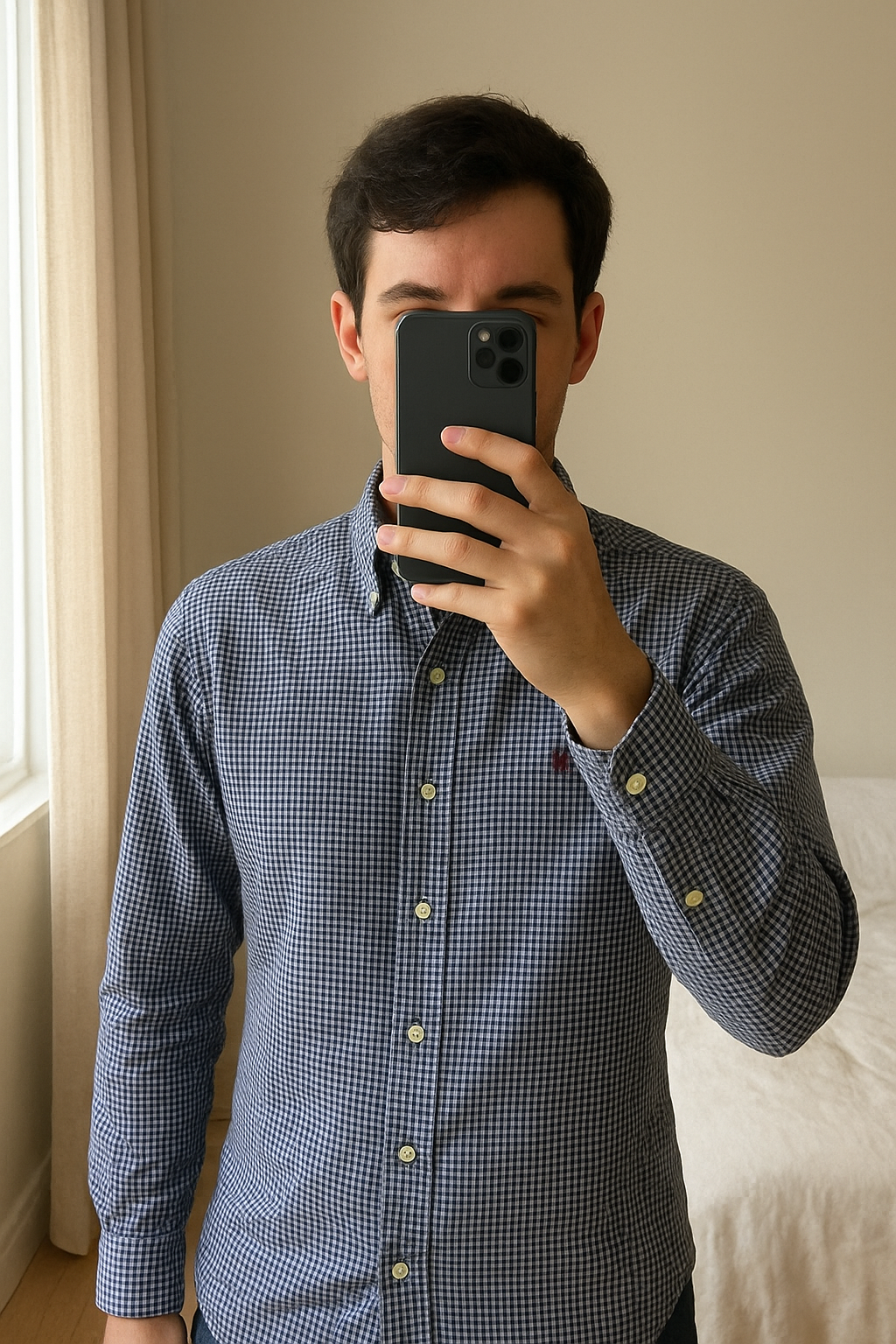 Chemise Ralph Lauren debout, face à la caméra, dans une chambre à la lumière douce, avec une lumière naturelle filtrant par la fenêtre.