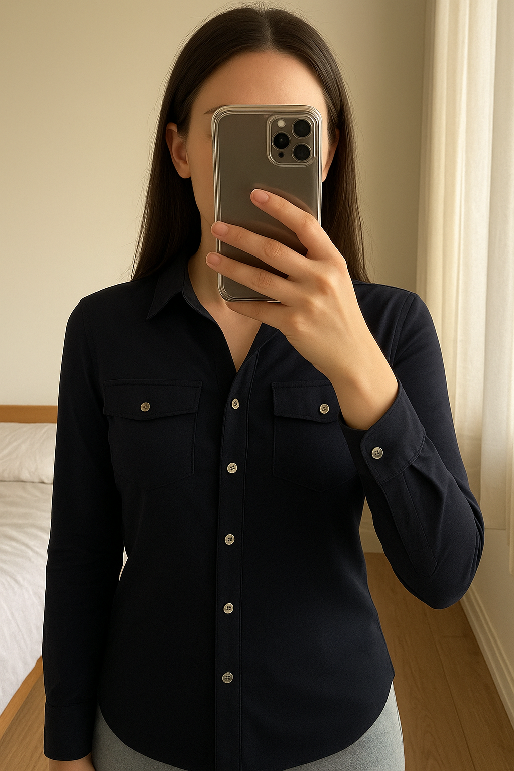 Chemise Ralph Lauren debout, face à la caméra, dans une chambre à la lumière douce, avec une lumière naturelle filtrant par la fenêtre.
