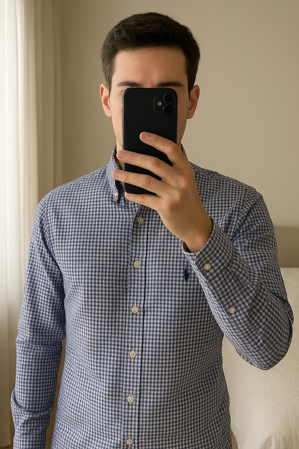Chemise Ralph Lauren debout, face à la caméra, dans une chambre à la lumière douce, avec une lumière naturelle filtrant par la fenêtre.