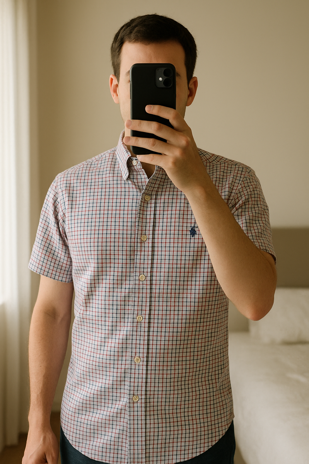 chemise Ralph Lauren taille M manches courtes debout, face à la caméra, dans une chambre à la lumière douce, avec une lumière naturelle filtrant par la fenêtre.