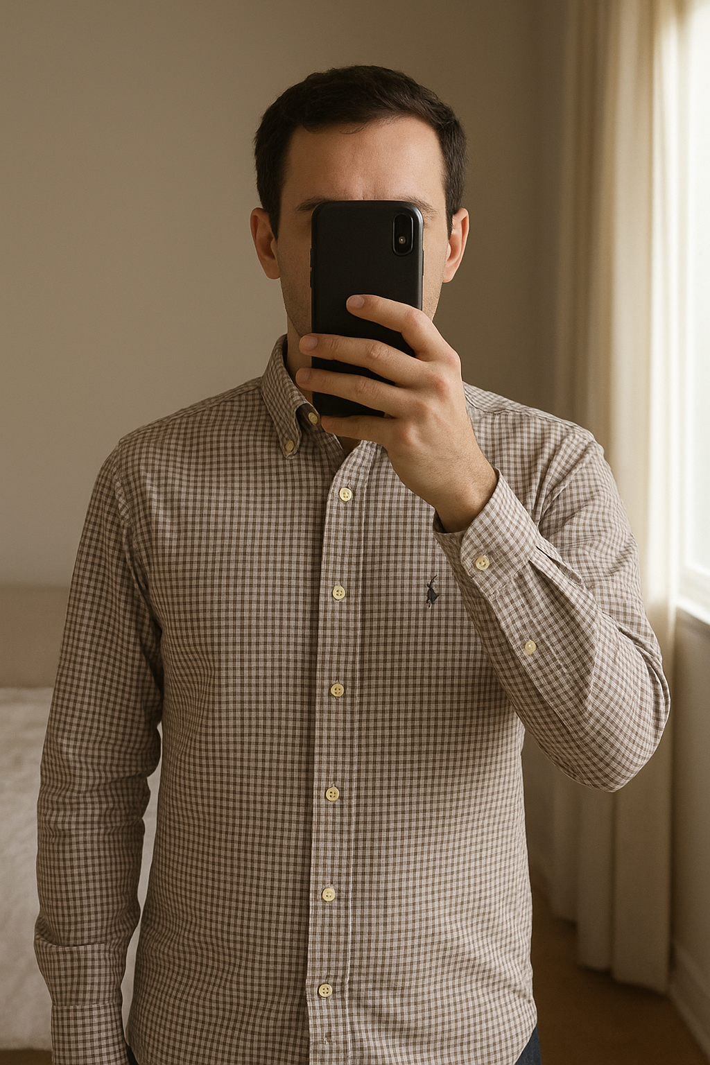chemise Ralph Lauren taille M manches courtes debout, face à la caméra, dans une chambre à la lumière douce, avec une lumière naturelle filtrant par la fenêtre.